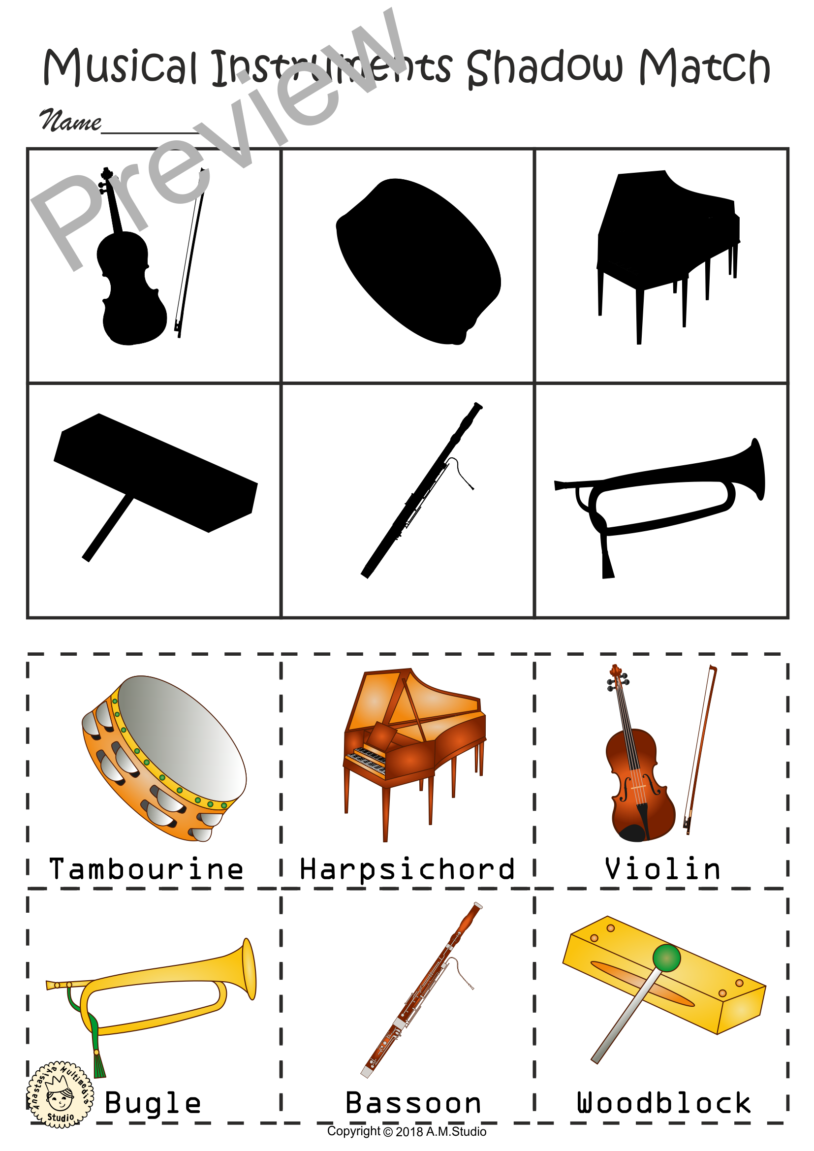 Musical Instruments Shadow Matching Cut And Paste Worksheets